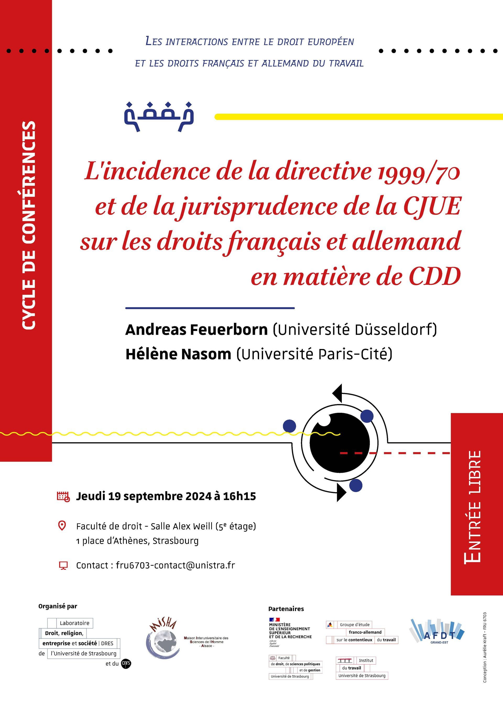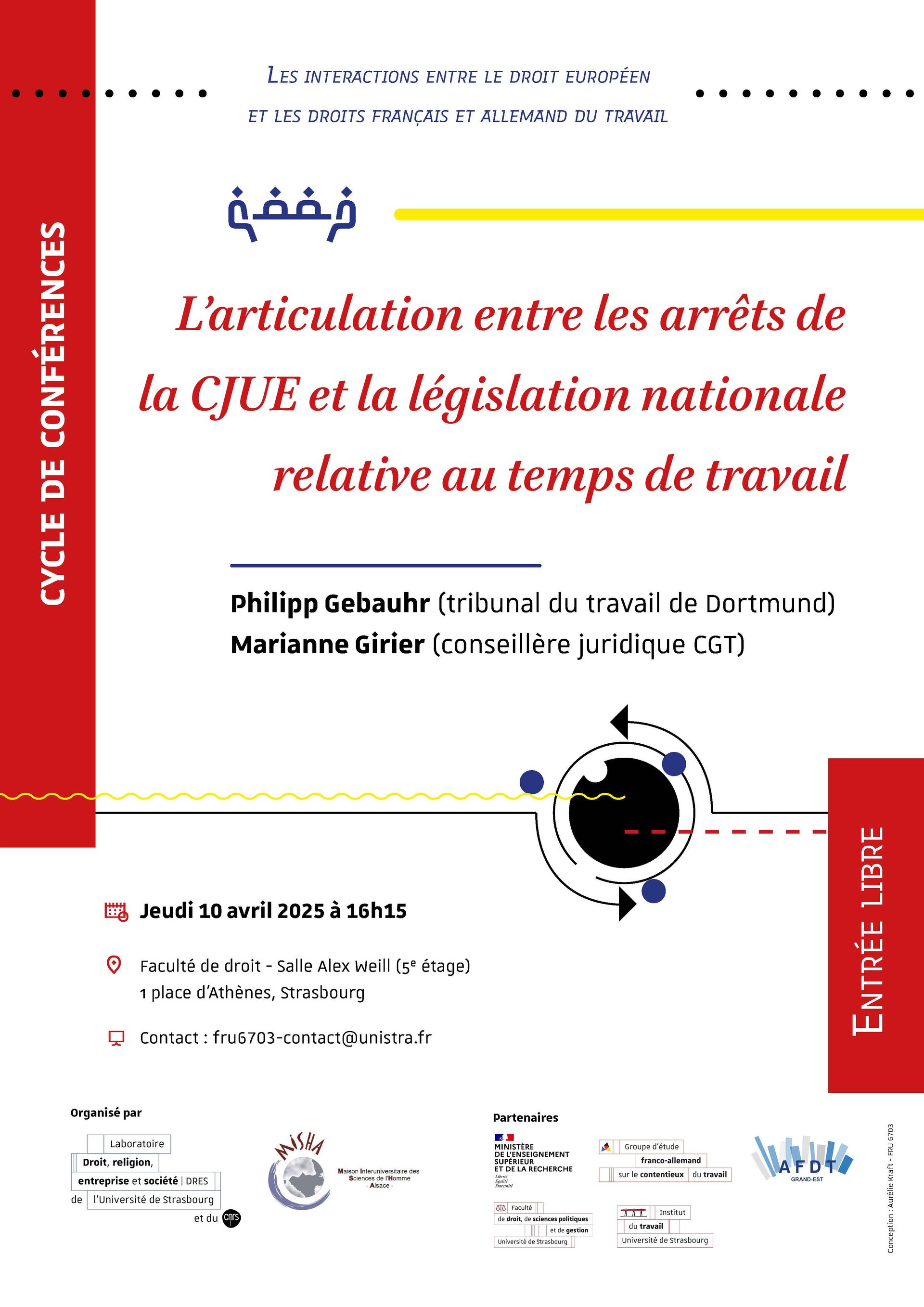 Benjamin Dabosville (MCF UMR 7354 DRES), ces conférences rassembleront des membres du GEFACT (Groupe d’Etudes Franco-allemand sur le Contentieux du travail) et des universitaires français et allemands. Chaque conférence aura une durée de deux heures, comprenant un temps d’échange avec la salle.