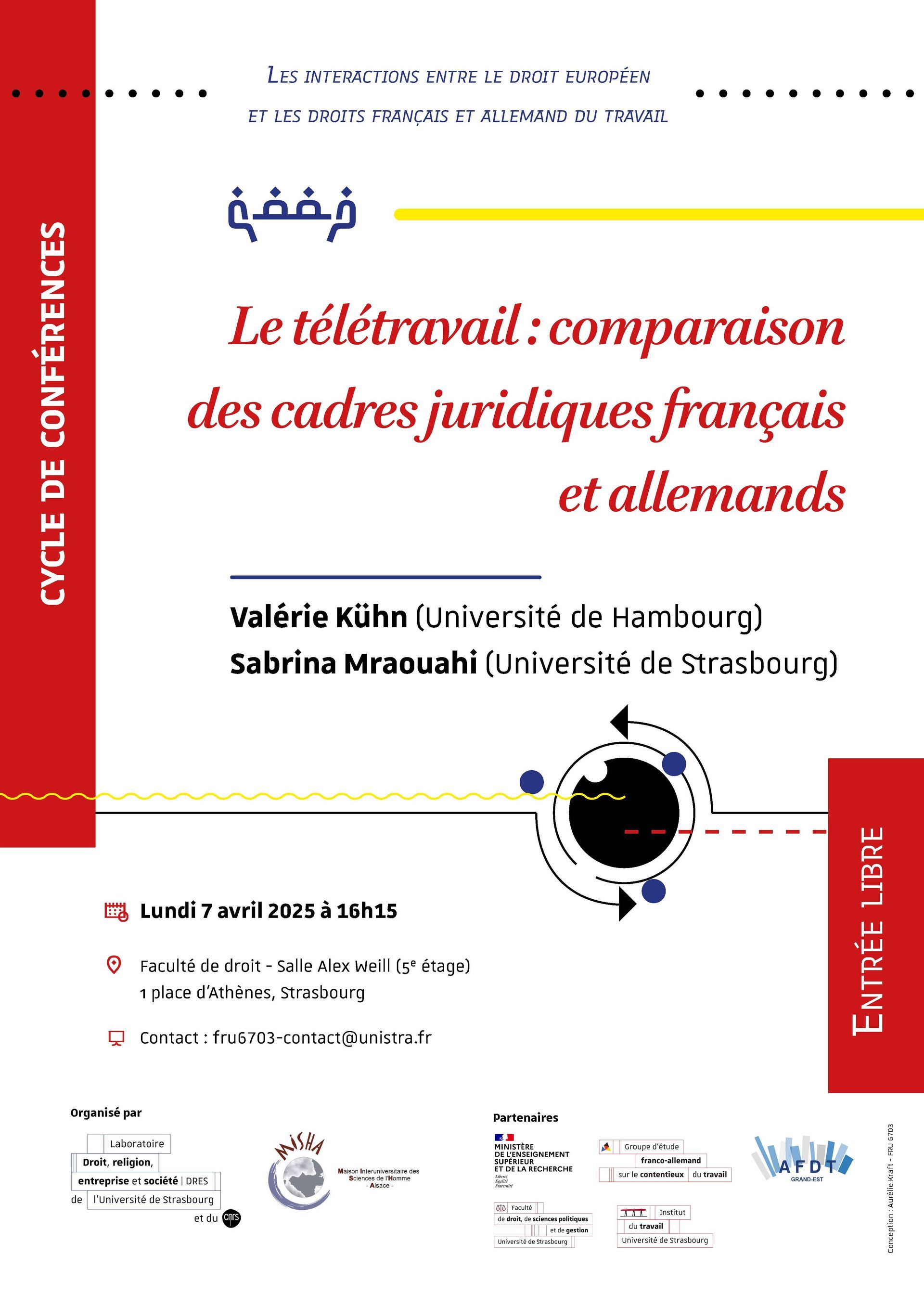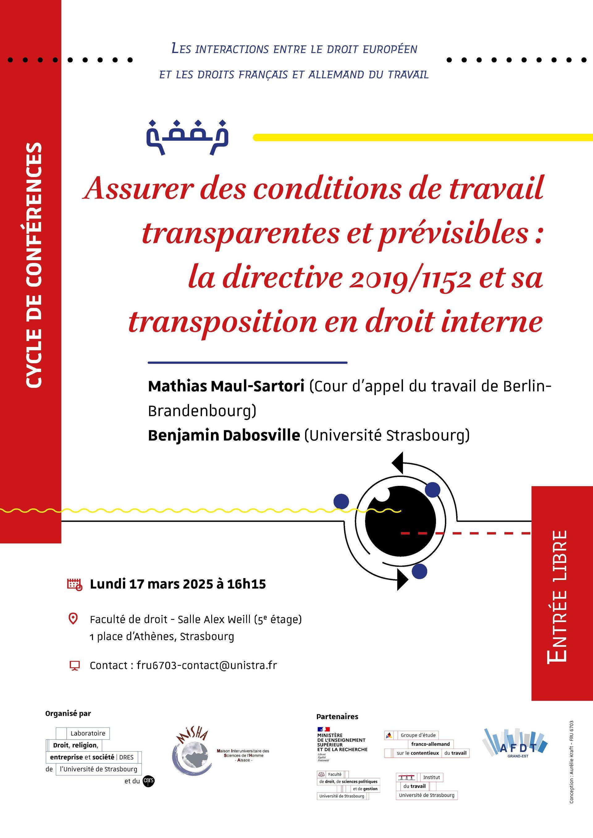 L’équipe Droit social de l'UMR 7354 Droit, Religion, Entreprise et Société (DRES), le laboratoire franco-allemand de la Maison Interuniversitaire des Sciences de l’Homme – Alsace (MISHA) et la section Grand-Est de l'Association française de droit du travail (AFDT) ont le plaisir d’organiser une série de conférences portant sur