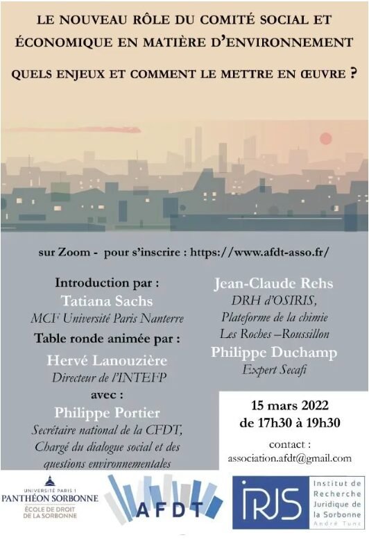 Tatiana Sachs, Maîtresse de conférences, Université Paris Nanterre - Hervé Lanouzière, Directeur de l’INTEFP - Philippe Portier, Secrétaire national de la CFDT, chargé du dialogue social et des questions environnementales - Jean-Claude Rehs, DRH d’OSIRIS, Plateforme de la chimie, Les Roches-Roussillon - Philippe Duchamp, Directeur régional SECAFI